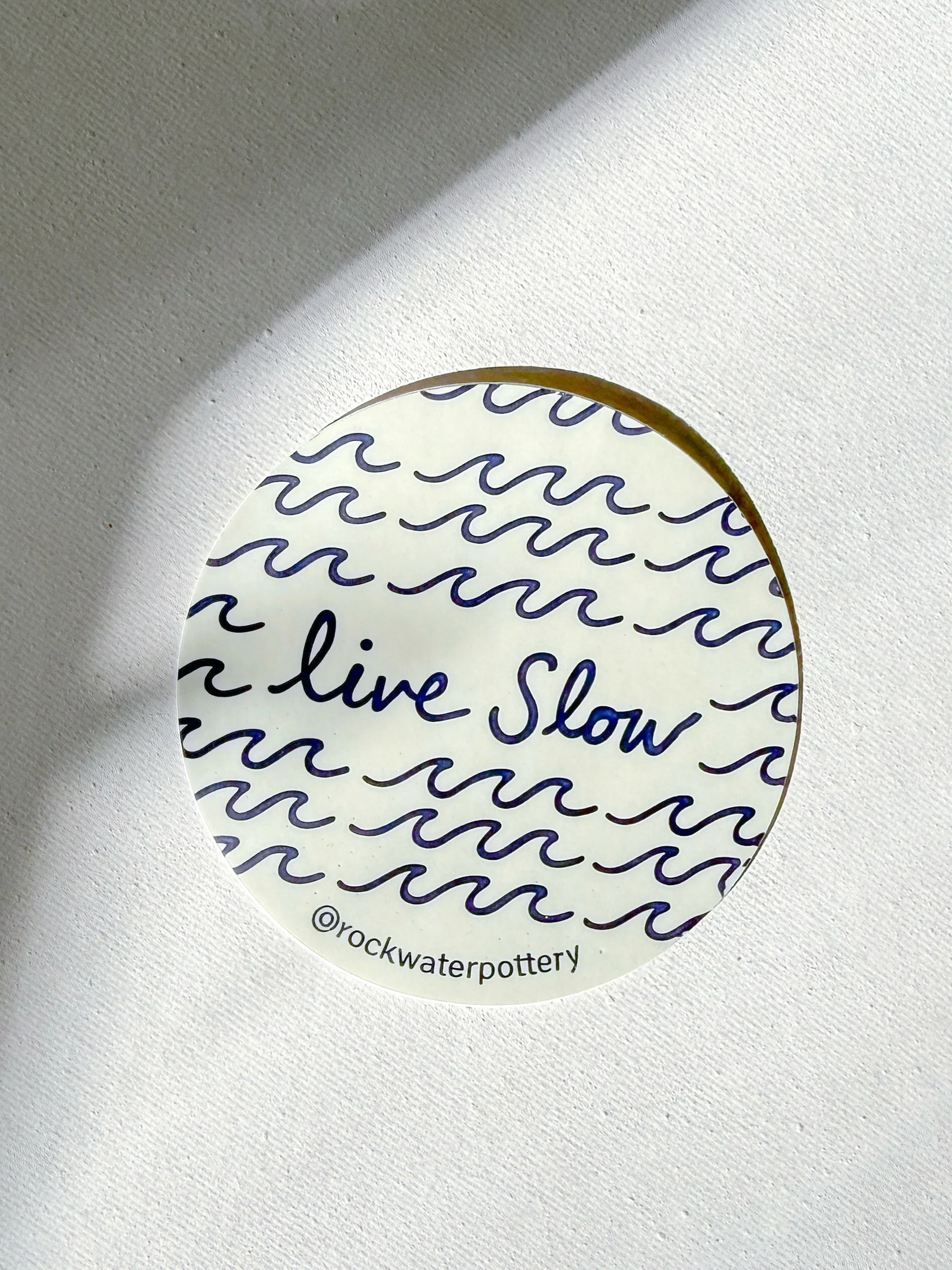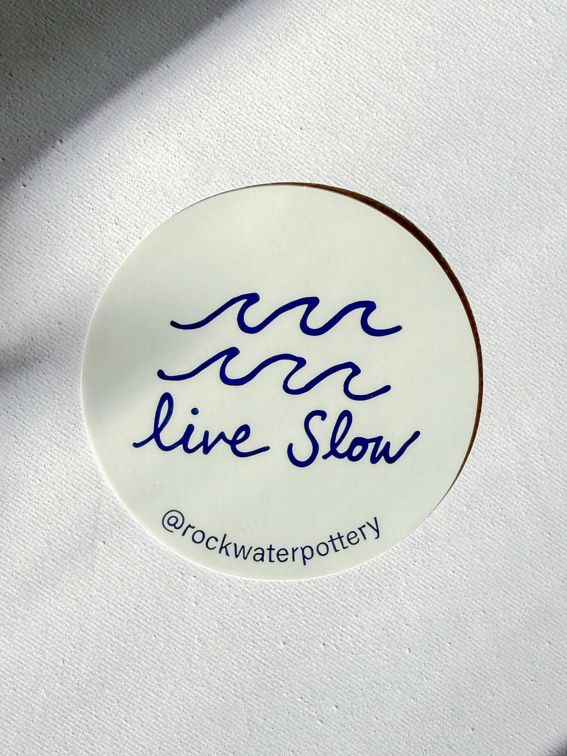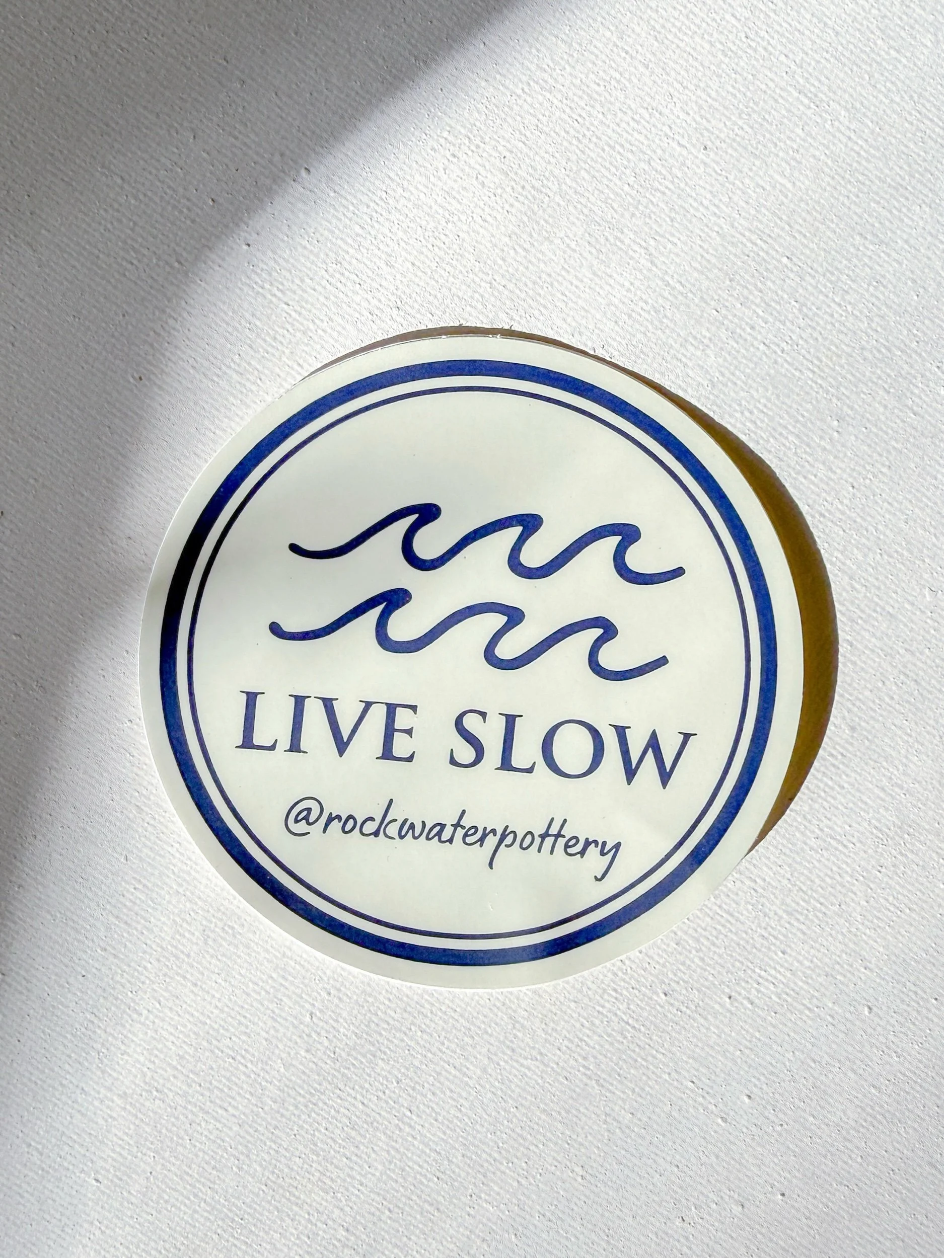 The Live Slow sticker features our signature wave design and hand-drawn navy lettering on a soft cream background.