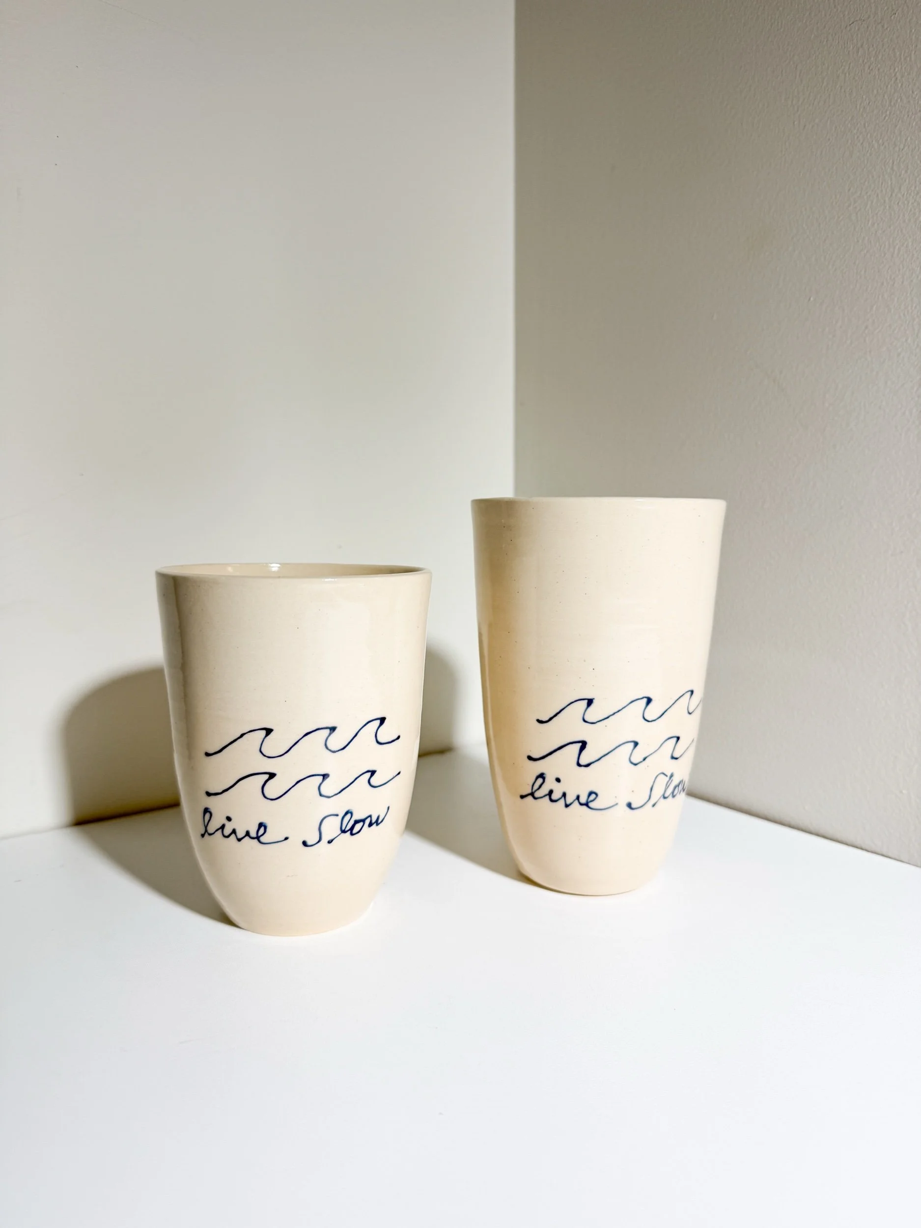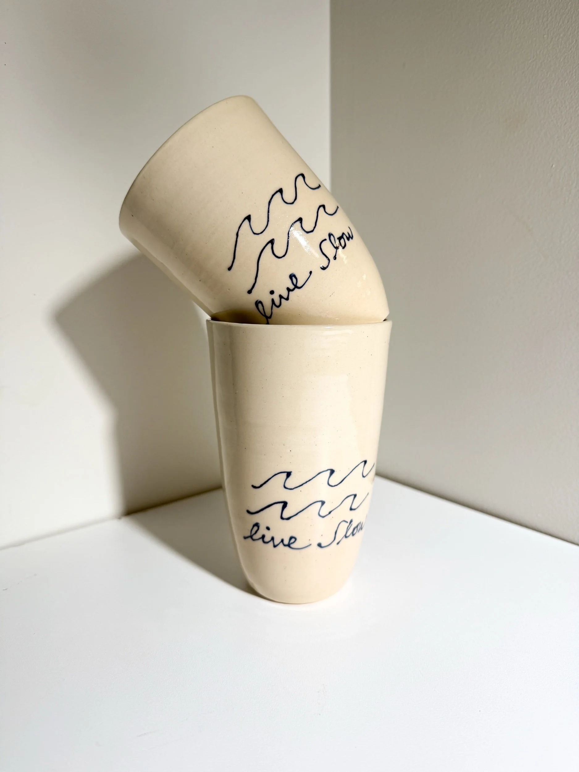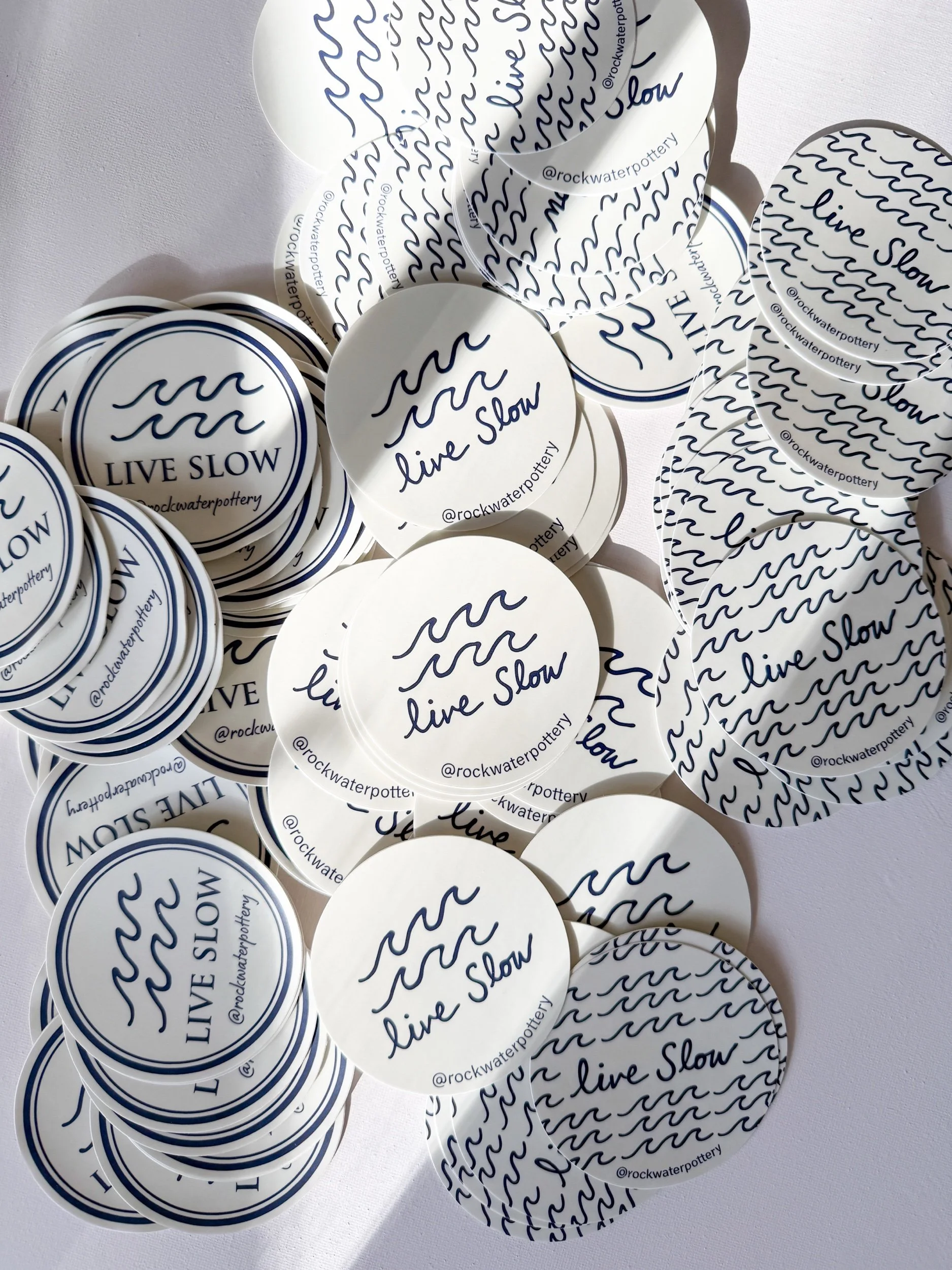 The Live Slow sticker features our signature wave design and hand-drawn navy lettering on a soft cream background.
